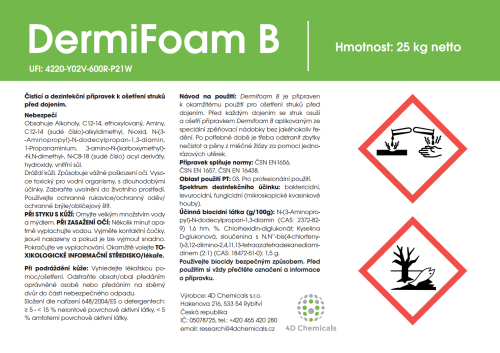 Dermifoam B je tekutý vysoce pěnivý přípravek pro ošetření struků před dojením. Kombinuje vysokou dezinfekční účinnost kyseliny D-glukonové se synergickým účinkem speciálních kosmetických přípravků a látek pro zjemnění pokožky a repelentních schopností extraktu z máty peprné.