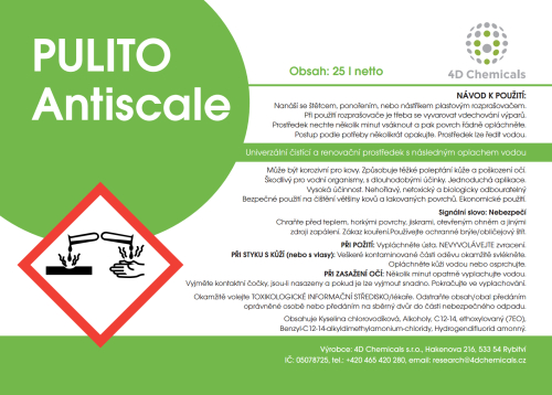 PULITO Antiscale je tekutý univerzální čistící a renovační prostředek, který se používá odstraňuje vápenaté usazeniny, vodní kámen, skvrny od rzi, minerální sedimenty a kaly.