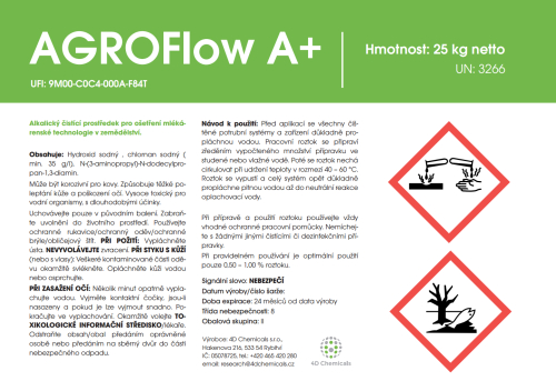 AgroFlow A+ je alkalický tekutý čistící přípravek určený pro každodenní čištění mlékárenské technologie v zemědělství a potravinářství. Vyznačuje se vysokou schopností směsi vybraných anorganických hydroxidů rozpouštět nečistoty organického původu a excelentní smáčecí schopností tenzidové směsi na bázi alkylsulfátů .